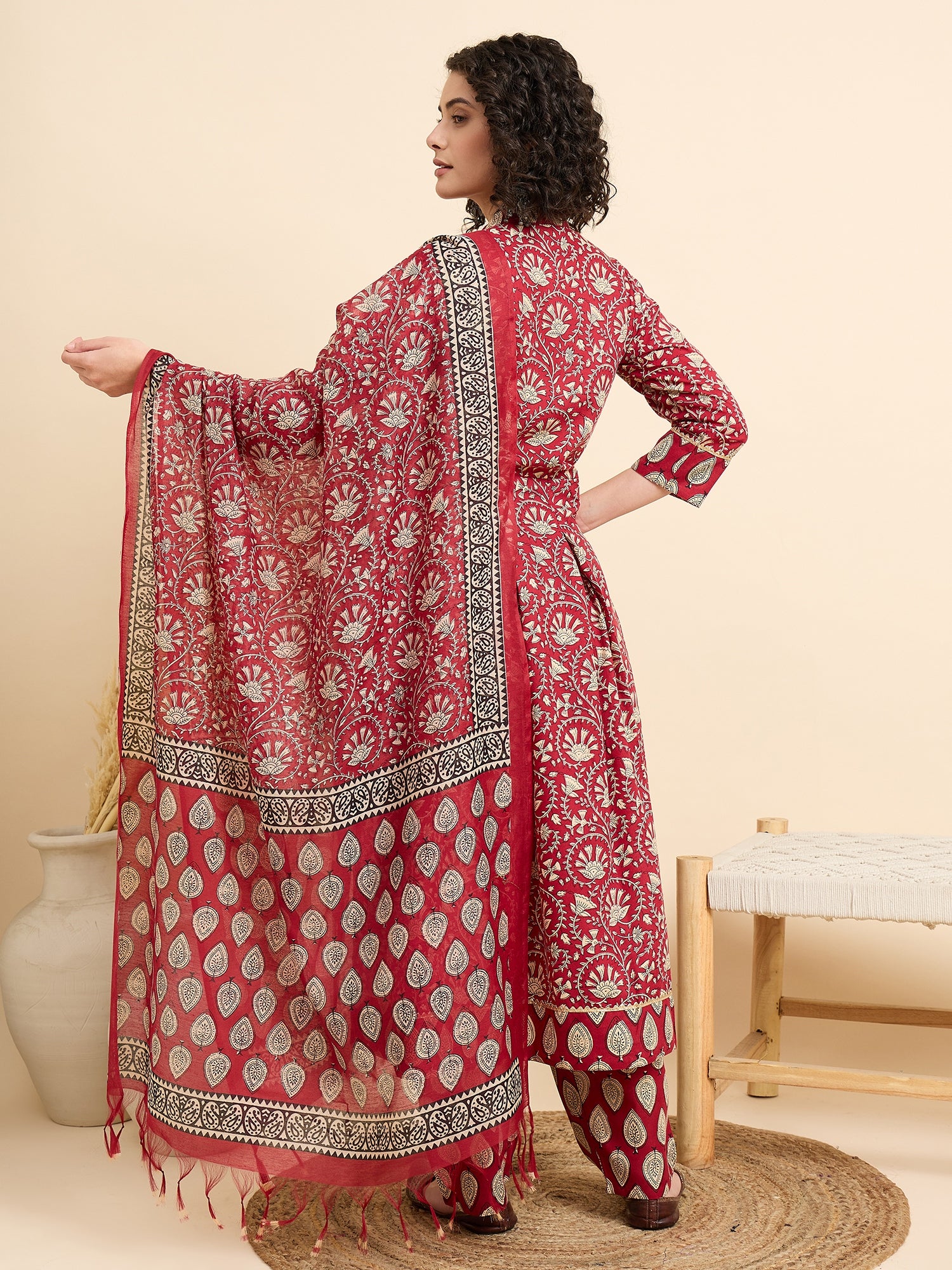 Mandarin Collar Red Anarkali Kurta And Pant Set With Dupatta